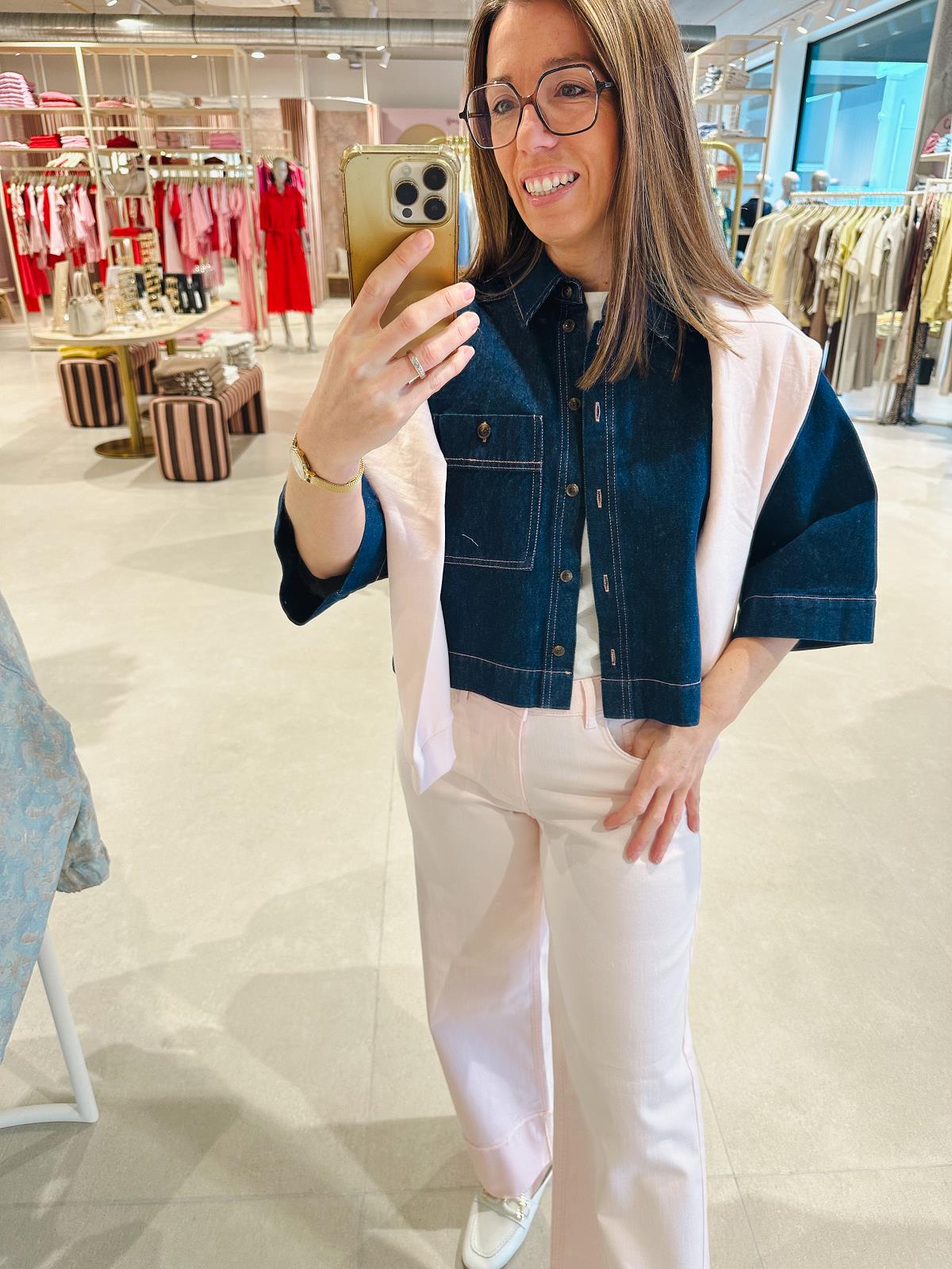 Deze donkere jeansblouse combineer je makkelijk met een trui of T-shirt als jasje.