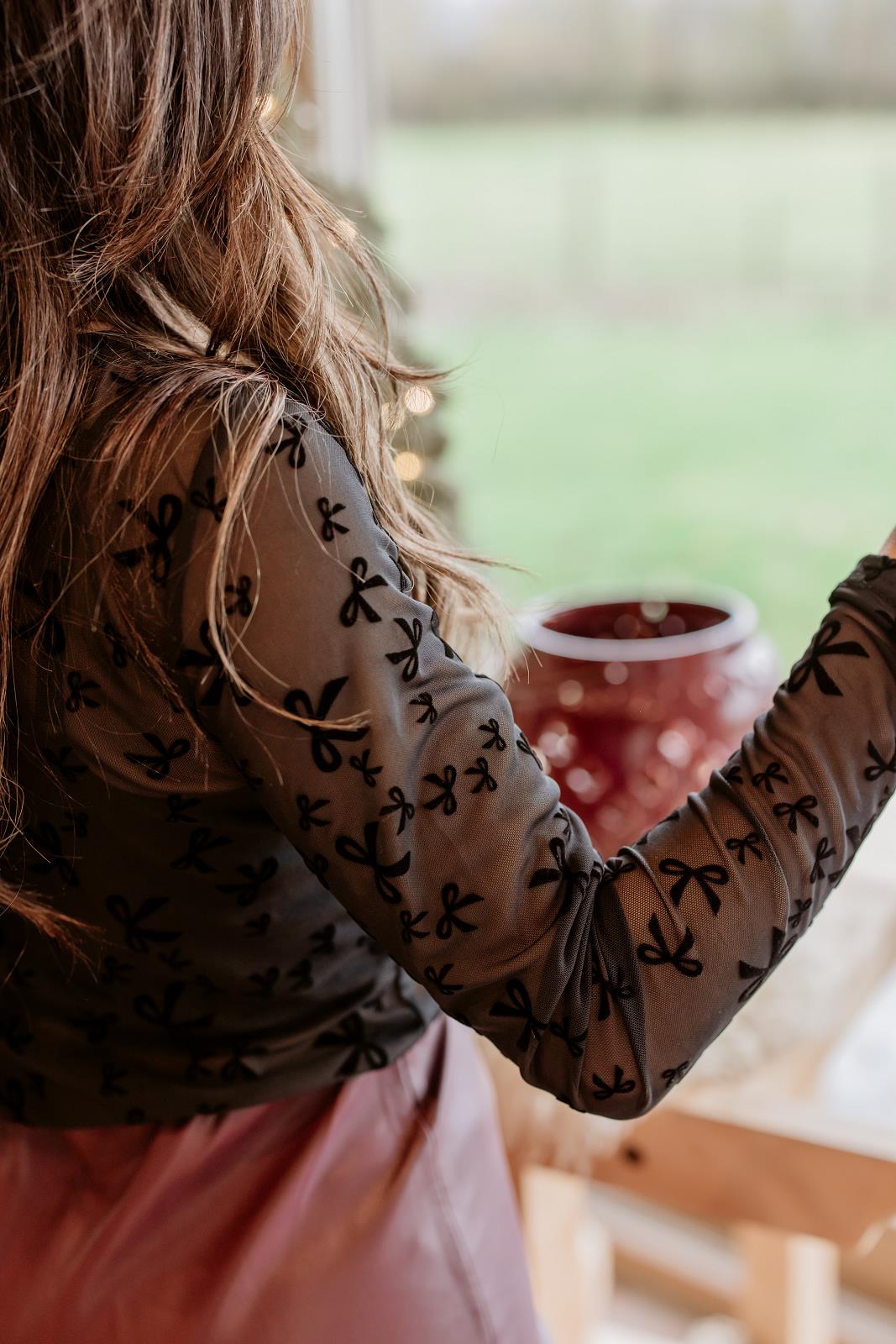 Deze zwarte blouse is een subtiele eyecatcher. Het doorschijnende materiaal en het delicate strikjesmotief geven een vrouwelijke, speelse touch. Draag hem casual op een jeans of chic onder een blazer voor een elegante, gelaagde look.