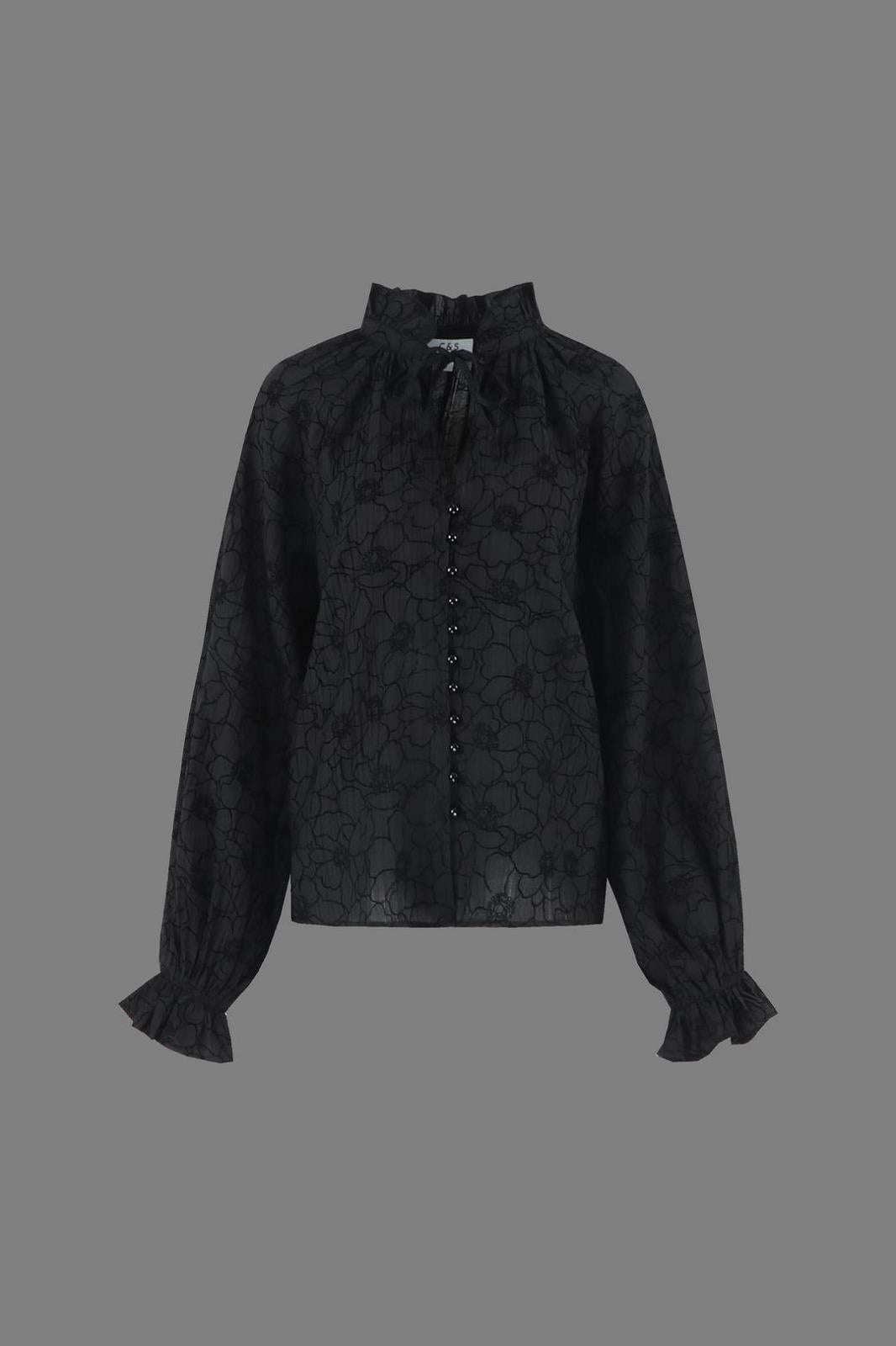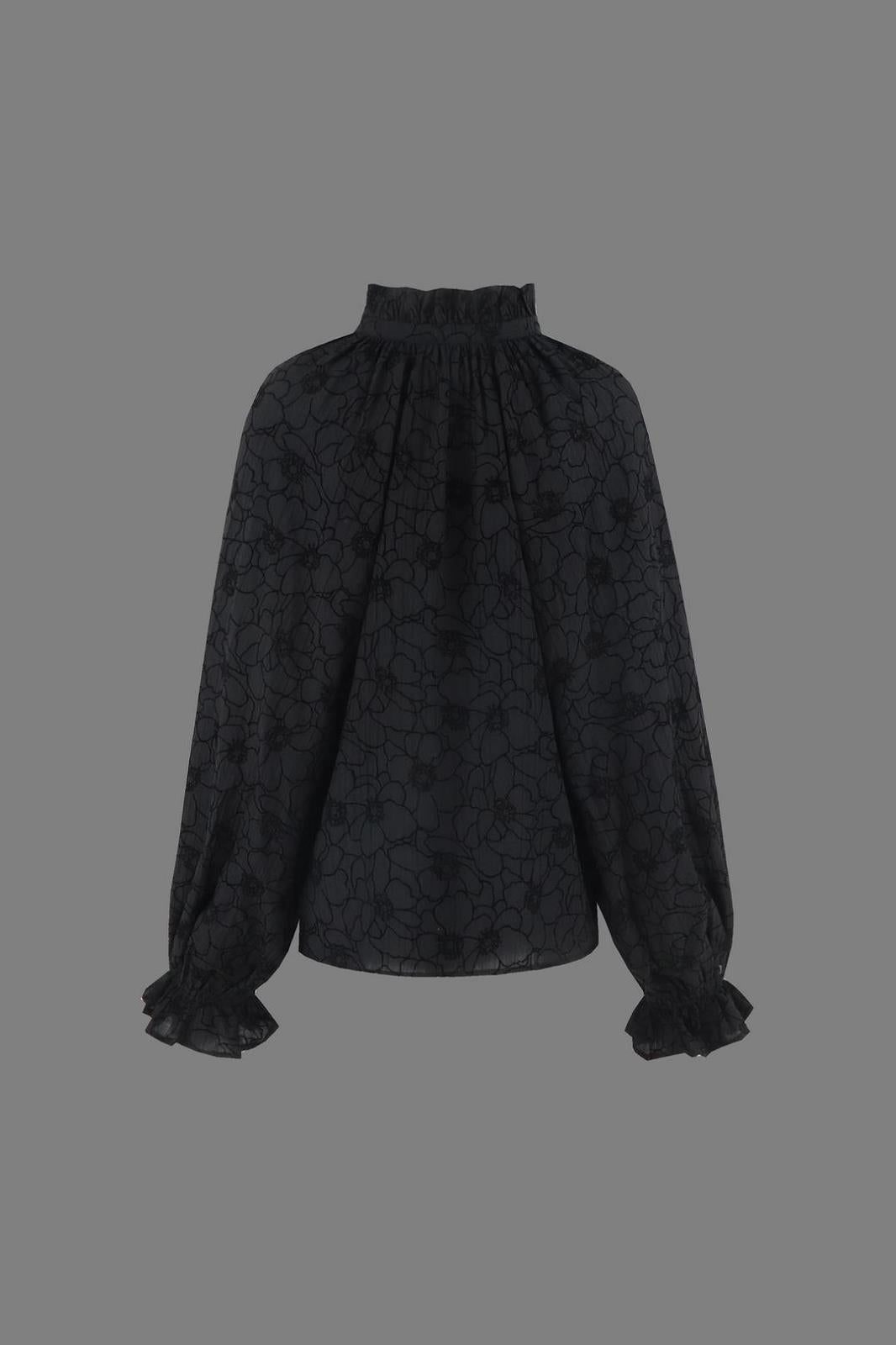 Deze blouse in bloemenmotief is een elegante en vrouwelijke toevoeging aan je garderobe. De ruches aan de hals en polsen geven een zachte, speelse touch, terwijl de licht vloeiende stof zorgt voor een comfortabele pasvorm. Perfect om te combineren met een stoffen broek, jeans of rok voor een stijlvolle look.