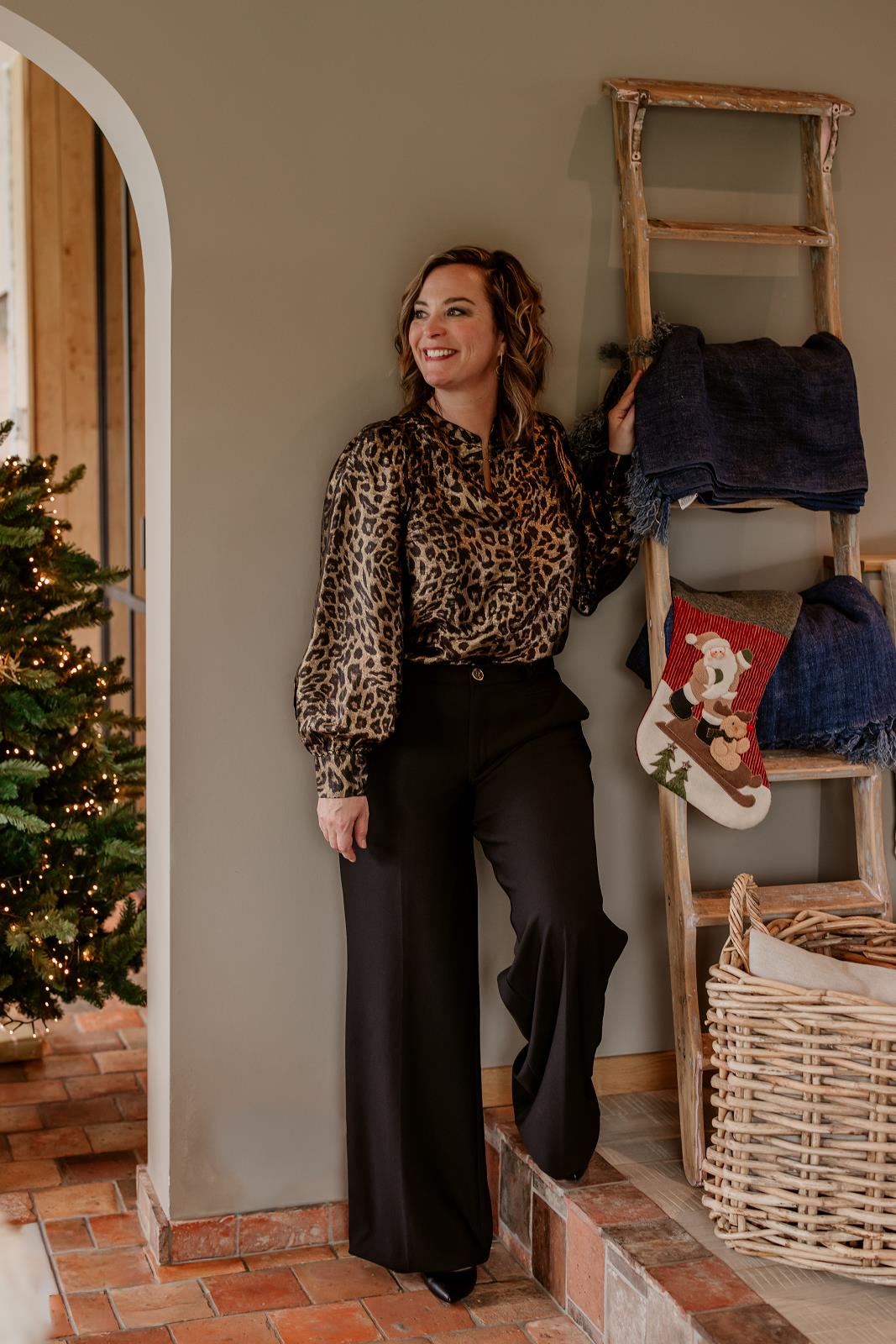 Deze zwarte broek combineert comfort met een luxueuze uitstraling. De brede pijpen zorgen voor een elegant silhouet, terwijl de gouden knoop een verfijnd accent toevoegt. Perfect te combineren met de bijpassende panterprint blouse voor een stijlvolle, zelfverzekerde outfit die past bij elk moment.