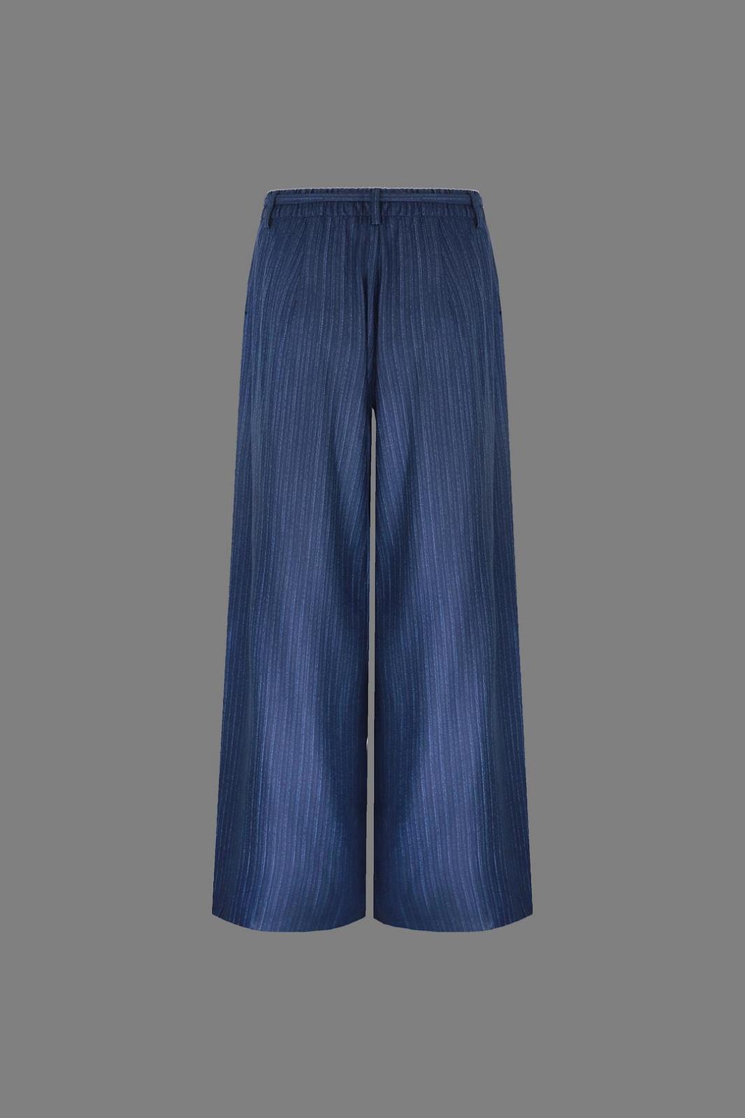 Deze donkerblauwe stoffen broek met witte strepen straalt klasse en elegantie uit. ? De brede pijpen zorgen voor een moderne, flatterende look, terwijl het lint aan de taille een vrouwelijk detail toevoegt en je silhouet mooi in vorm brengt. Ideaal om te combineren met een effen blouse of knit voor een stijlvolle outfit.