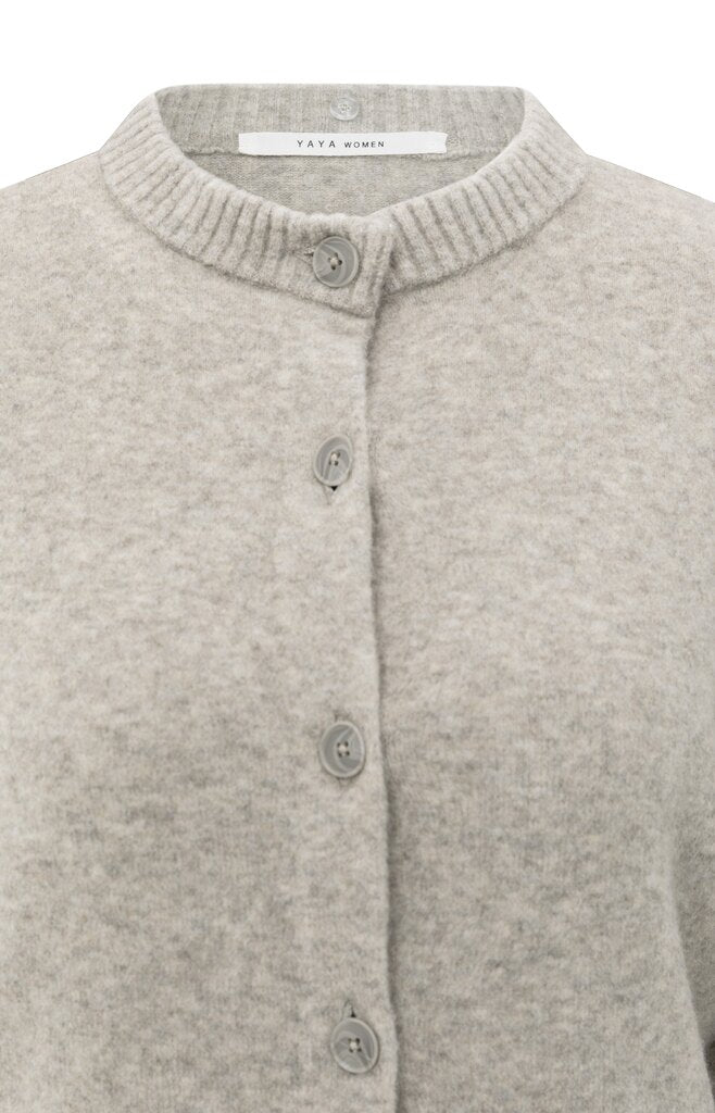 Een elegant grijs wollen truitje met lange mouwen, dat klasse en veelzijdigheid uitstraalt. Het witte afneembare kraagje geeft een frisse toets, terwijl de knopen vooraan zorgen voor een verfijnde afwerking. Ideaal om zowel chic als casual te stylen.