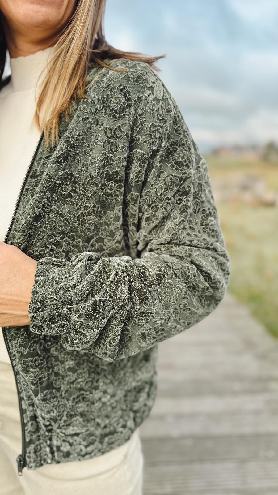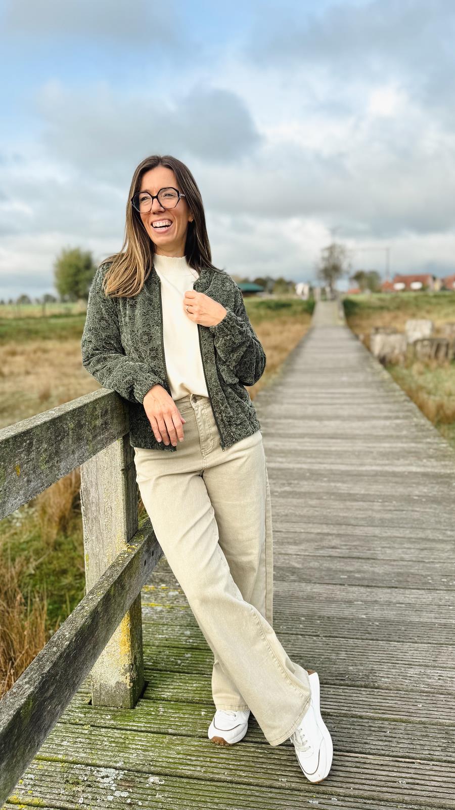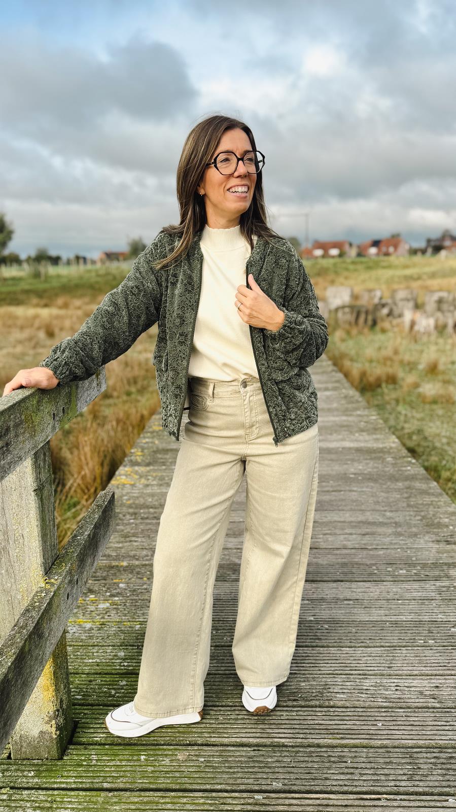 - Wam kaki kleur met opgenaaide broderie in een bloemenmotief.