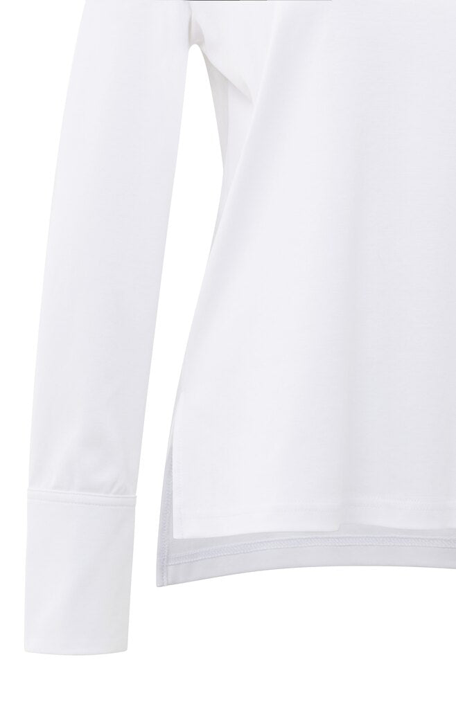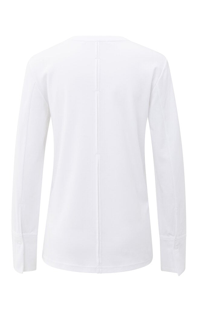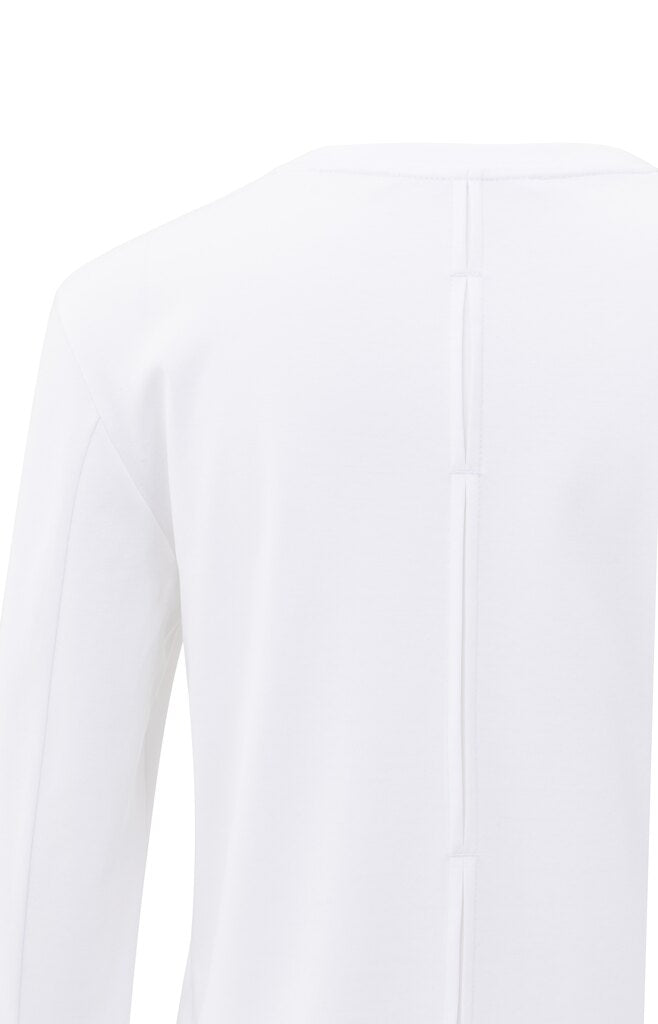 Een elegant wit topje met lange mouwen en een ronde hals. De subtiele splits aan beide onderkanten geven een moderne twist, terwijl het knoopje aan de polsen een verfijnd detail toevoegt. Perfect te combineren met broeken, rokken of jeans voor een casual chic of geklede look.